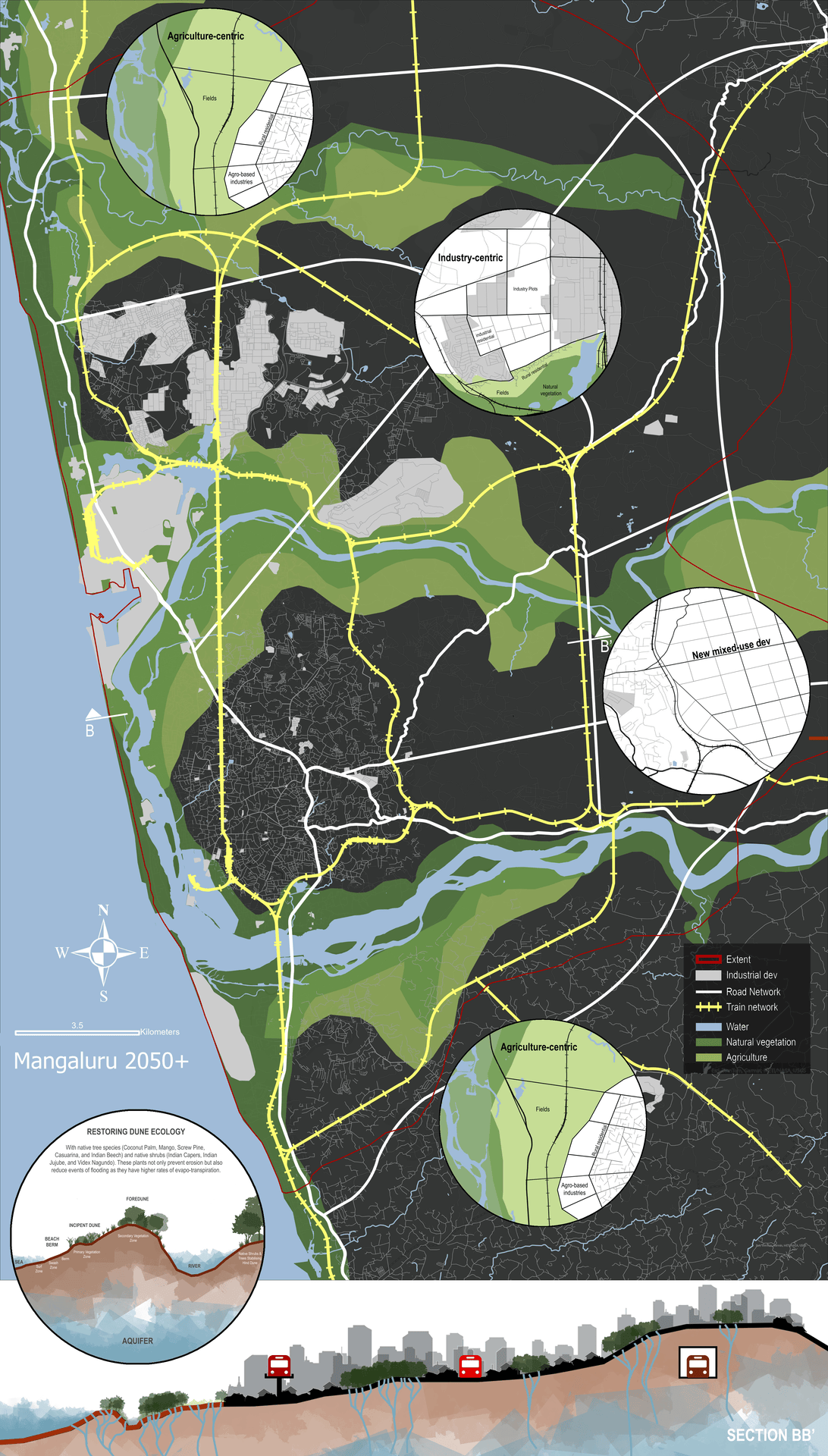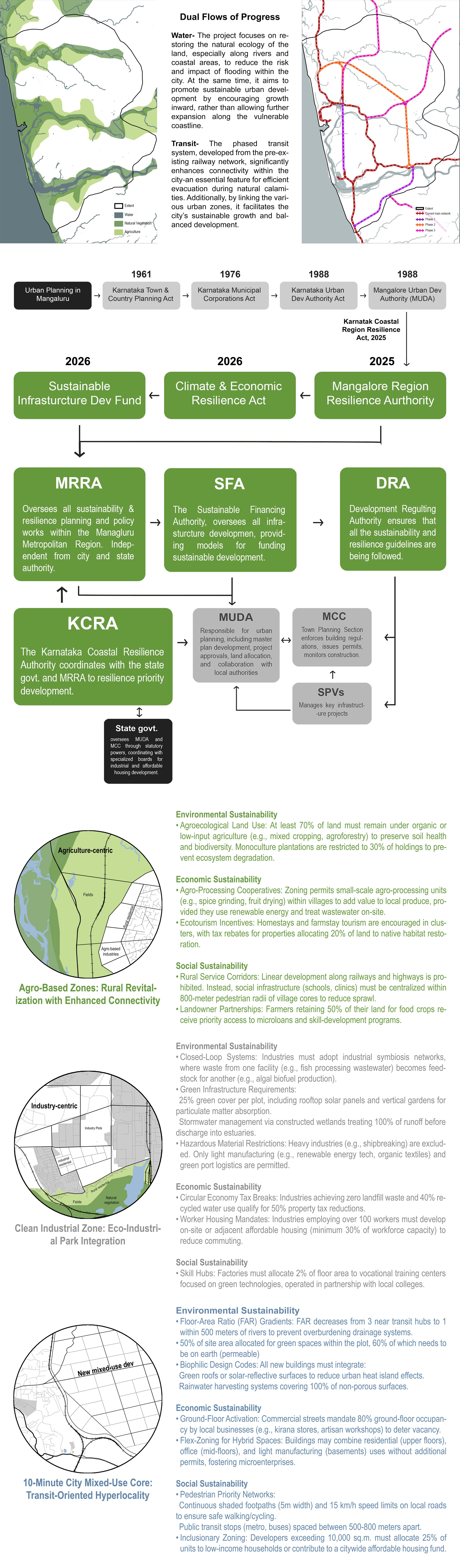 In response to these dual threats—monsoon flooding and coastal vulnerability—this project proposes Mangaluru's Dual Flows of Progress: a 2050 urbanization model that interweaves blue–green water systems with a phased transit network to steer growth inward, improve flood resilience, and prevent sprawl along the vulnerable coastline.