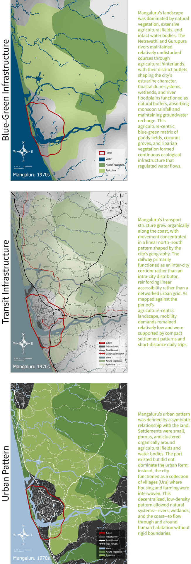 Mangaluru (Mangalore) was selected as the focus city to extend previous research on the changing dynamics of rural landscapes and regional anti-sprawl strategies. Where that earlier work examined regional-scale frameworks for curbing urban expansion, this project zooms in to the city scale—exploring how climate-resilient urban development can be structured to direct growth inward and prevent vulnerable coastal sprawl while addressing Mangaluru's specific water, transit, and governance challenges.