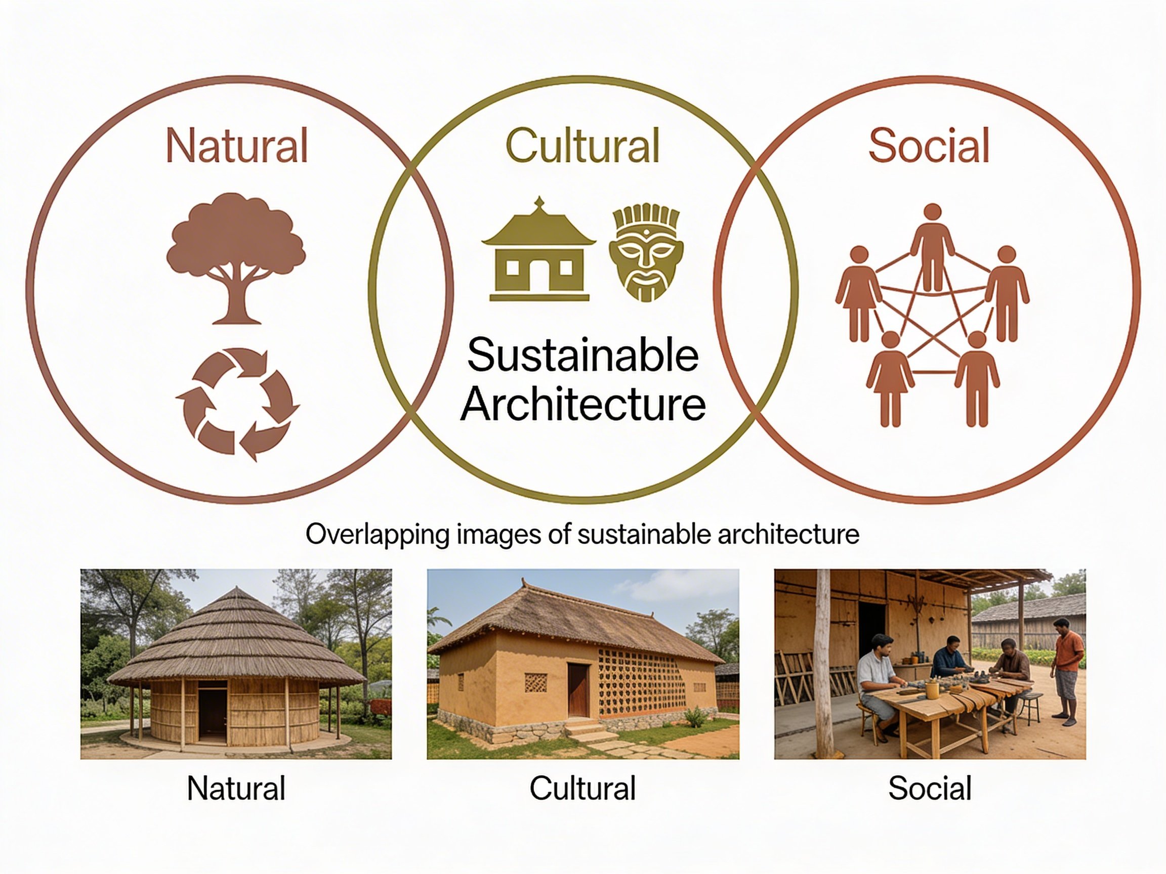 Conventional sustainability discourse often narrows to environmental metrics, rating systems, and technological add-ons, leaving deeper social and cultural questions unaddressed. When transplanted uncritically into rural contexts, such approaches slide toward greenwash and culturewash, aestheticising “eco” imagery without engaging local practice or economic reality. The research instead adopts a multi-dimensional understanding of sustainable architecture built around three overlapping images—the natural, the cultural, and the social—treated as interdependent rather than parallel checklists. This framework asks how architecture can regenerate ecologies, support traditional livelihoods, and transmit cultural knowledge simultaneously, positioning rural sustainability as a question of relationships rather than objects.