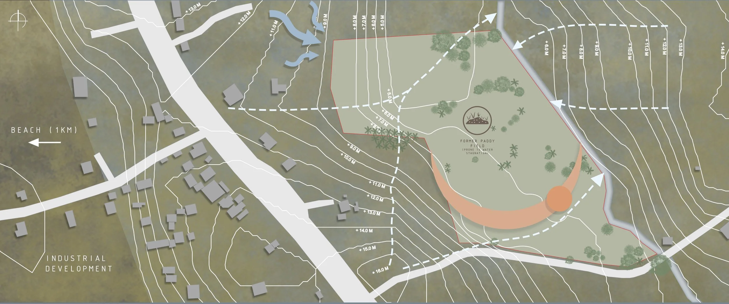 Building on these insights, the thesis articulates the idea of “architecture that sustains the rural realm” as both physical and programmatic infrastructure. Rather than treating buildings as static objects, the proposal considers architecture as a medium through which relationships between ecology, economy, and culture are continually negotiated. The natural image directs attention to water, soil, and vegetation patterns on the coastal site: drainage lines, prevailing winds, monsoon behaviour, and existing tree cover inform the orientation and porosity of the built form. The cultural image draws spatial logics from Guttu houses and rural public buildings—courtyards, shaded otlas, thick masonry bases—while adapting to pressing material constraints like regional timber scarcity through innovative structural solutions.