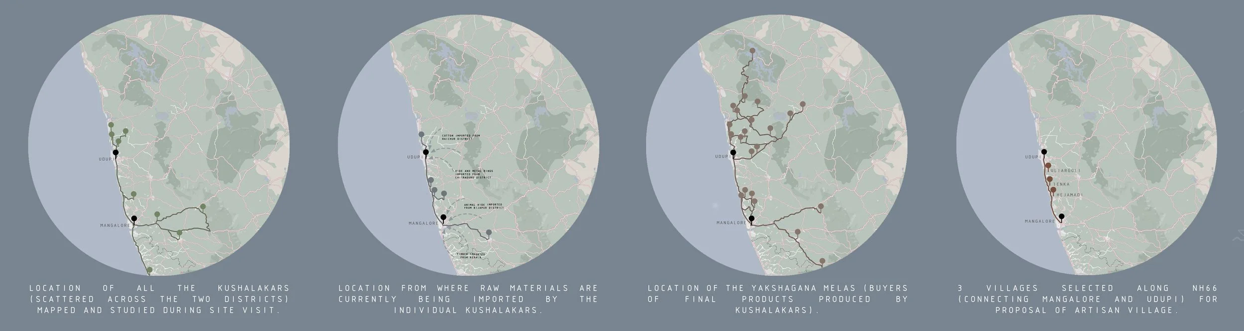 Mapping emerges as a key tool for making a largely invisible community legible at a territorial scale. Layers chart the locations of Yakshagana troupes, artisan homes, existing cultural institutions, and regional infrastructure such as NH66 and local markets. Patterns show artisans orbiting performance circuits yet rarely co-locating, with long travel distances, fragmented supply chains, and modest incomes limiting collaboration. The mapping also reveals micro-geographies of opportunity—nodes where transport access, available land, and cultural memory converge—suggesting that a carefully located architectural intervention could re-knot dispersed threads into a shared fabric