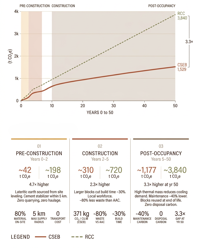 The lifecycle carbon assessment is structured across pre-construction, construction, and post-occupancy phases. In the pre-construction phase, the sourcing of over 80% of raw material from site levelling (yielding approximately 5,774 cu.m of earth against a requirement of 4,131 cu.m) eliminates quarrying, long-distance haulage, and associated emissions. The construction phase benefits from CSEB's larger block dimensions relative to fired brick, reducing the number of units required per square metre of wall and shortening build time by approximately 30%, with a corresponding reduction in site energy and labour carbon. Post-occupancy, CSEB's higher thermal mass significantly reduces the energy demand for cooling in the tropical coastal climate of Tenka, while its lower maintenance requirements and complete reusability at end of life — the blocks can be re-crushed and reused as fresh CSEB without chemical treatment — close the material loop and eliminate disposal carbon entirely.