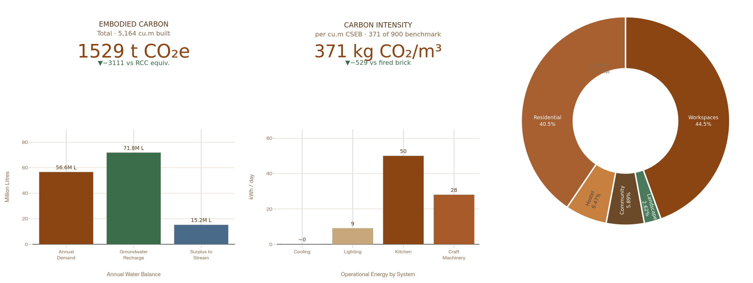 The environmental performance of Yakshahalli is assessed across four categories: embodied carbon, operational energy, water management, and ecological footprint. Total embodied carbon for the built programme is calculated at approximately 1,529 tonnes CO₂ equivalent across 5,164 cu.m of built volume — substantially below the equivalent figure for a conventional RCC construction of the same programme. Operational energy demand is near-zero for cooling and ventilation given the passive systems described above, with residual demand limited to lighting, kitchen equipment, and craft machinery. The water management strategy achieves a positive annual balance, recharging approximately 71.8 million litres to the groundwater table against a total annual demand of 56.6 million litres, generating a surplus of 15.2 million litres that drains naturally to the adjacent stream. The site's ecological footprint is net-positive, with bio-drainage planting, productive homestead gardens, and natural landscape retention together increasing biodiversity and green cover relative to the pre-design baseline.