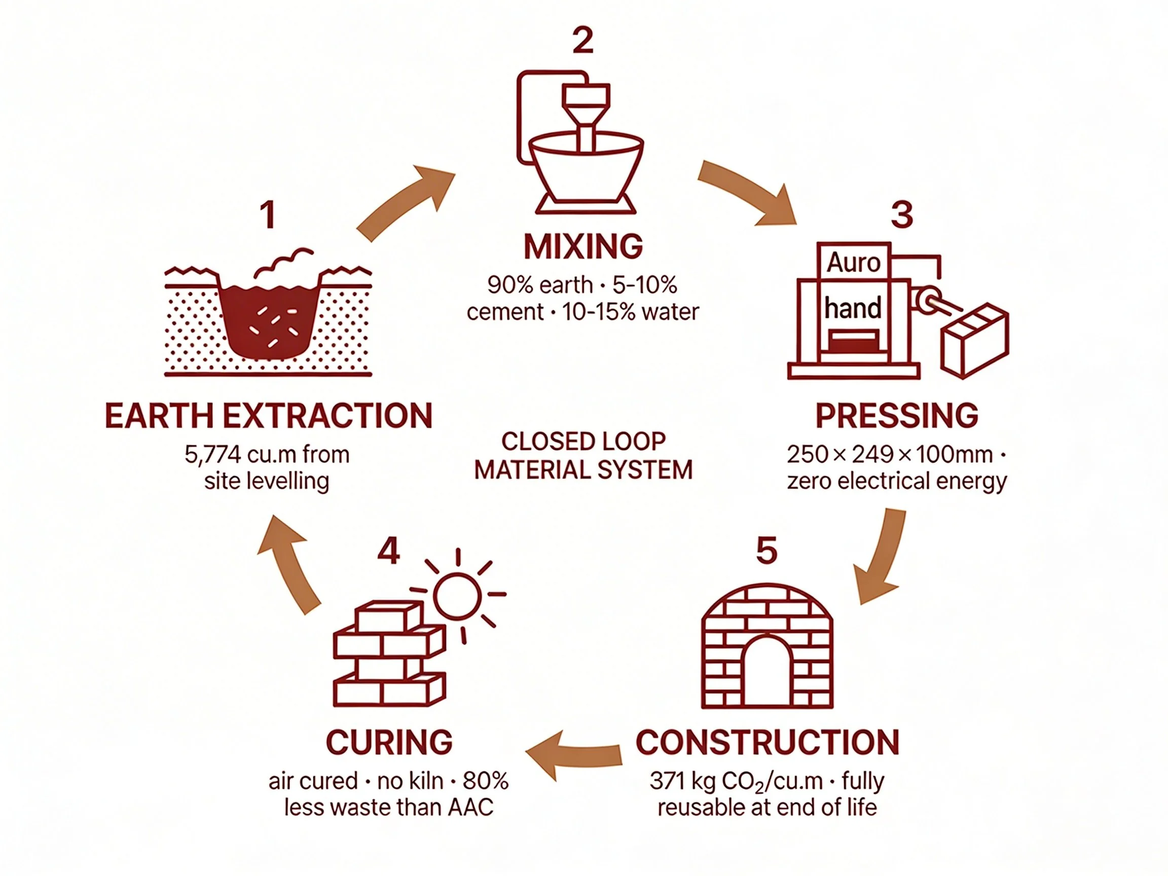 Compressed Stabilized Earth Blocks are produced on site using a mixture of approximately 90% lateritic earth and 10% cement stabilizer, with water sourced from the stream along the eastern site boundary. The blocks are formed using manually operated Auro-handpress machines, requiring no kiln firing and generating minimal process waste. The entire production cycle — from raw material extraction to block formation — takes place within the site boundary, eliminating transportation as a significant carbon contributor and creating a closed-loop material system that is both economically and ecologically viable for the rural context.