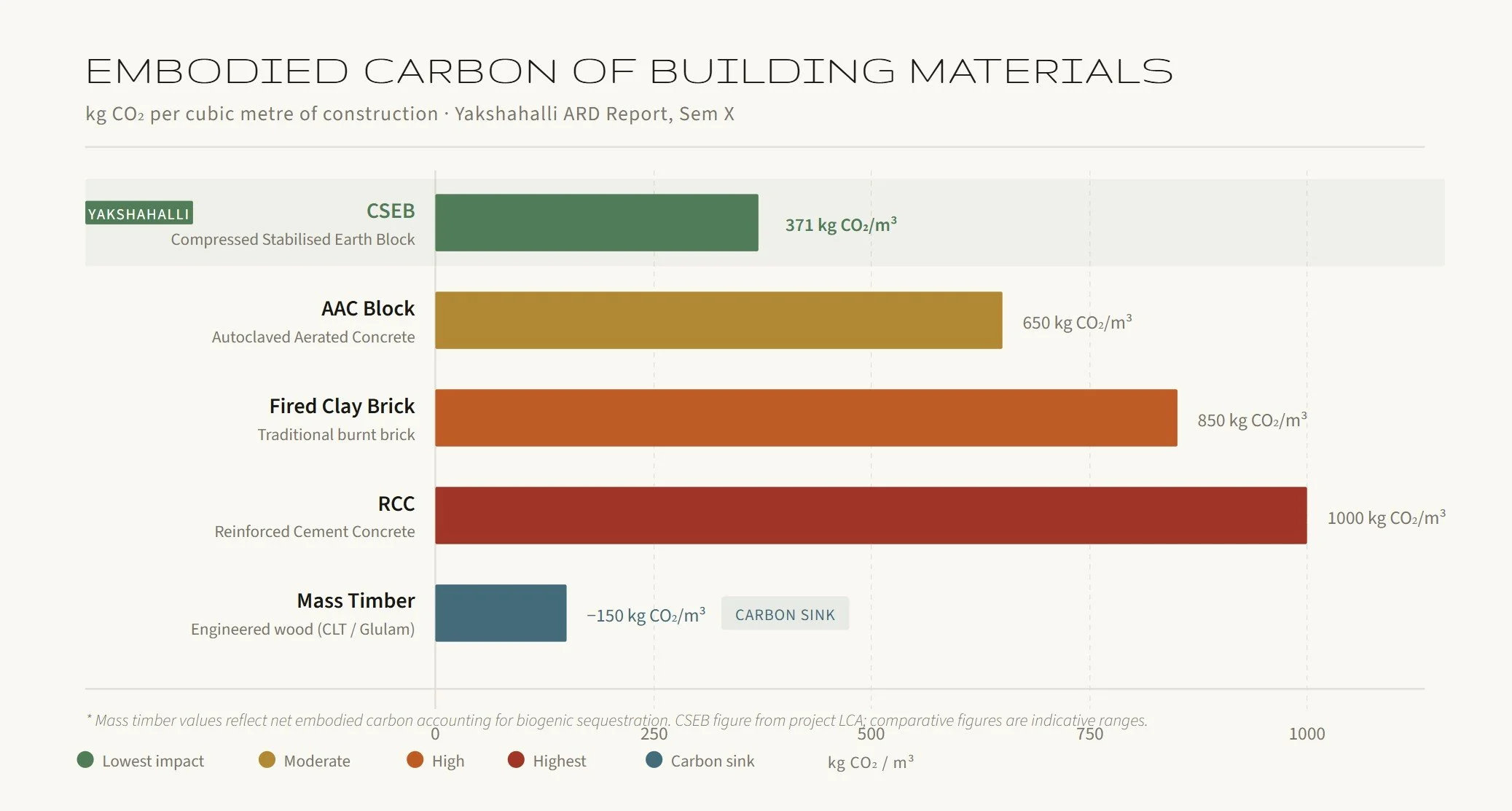 This analysis evaluates the environmental and social performance of Yakshahalli, a proposed artisan settlement in Tenka, coastal Karnataka, across three intersecting frameworks: embodied carbon and lifecycle assessment of the primary construction material — Compressed Stabilized Earth Blocks — thermal performance benchmarking of the CSEB vault roofing system against conventional timber alternatives, and an ESG reporting framework that captures the project's environmental, social, and governance dimensions. Together, these assessments constitute a post-design audit that grounds the project's sustainability claims in measurable, comparative, and replicable terms.