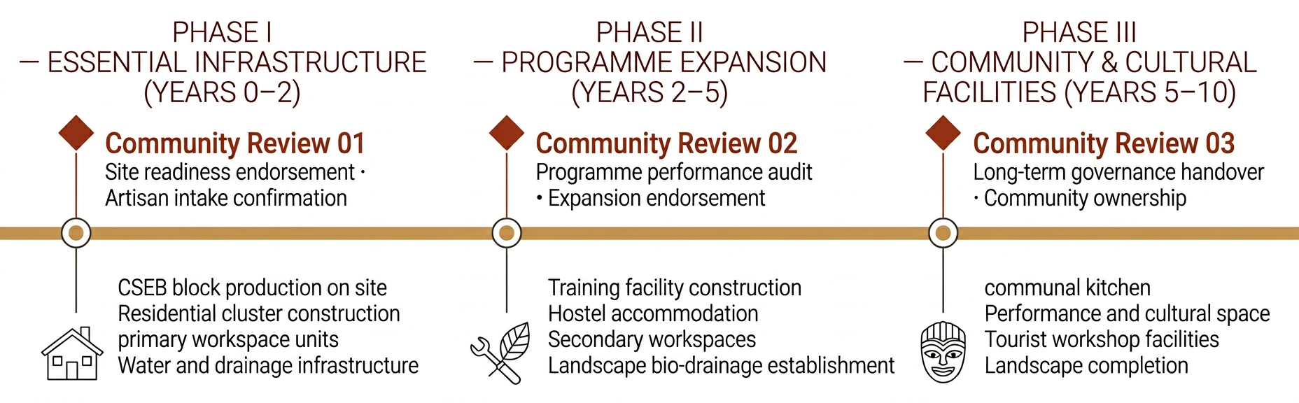 The governance dimension of the framework addresses material traceability, construction transparency, community participation, and phased delivery accountability. The on-site production of CSEB creates a fully traceable material supply chain, with raw material sourcing, block production, and structural deployment all occurring within a defined and documentable boundary. The phased implementation strategy embeds community oversight at each stage of delivery, ensuring that design decisions can be reviewed, adapted, and endorsed by the artisan community as the settlement evolves. The project's alignment with twelve UN Sustainable Development Goals provides an internationally legible accountability framework, while the use of locally available and replicable construction techniques ensures that the governance model can be maintained by the community independently of external technical expertise over time.