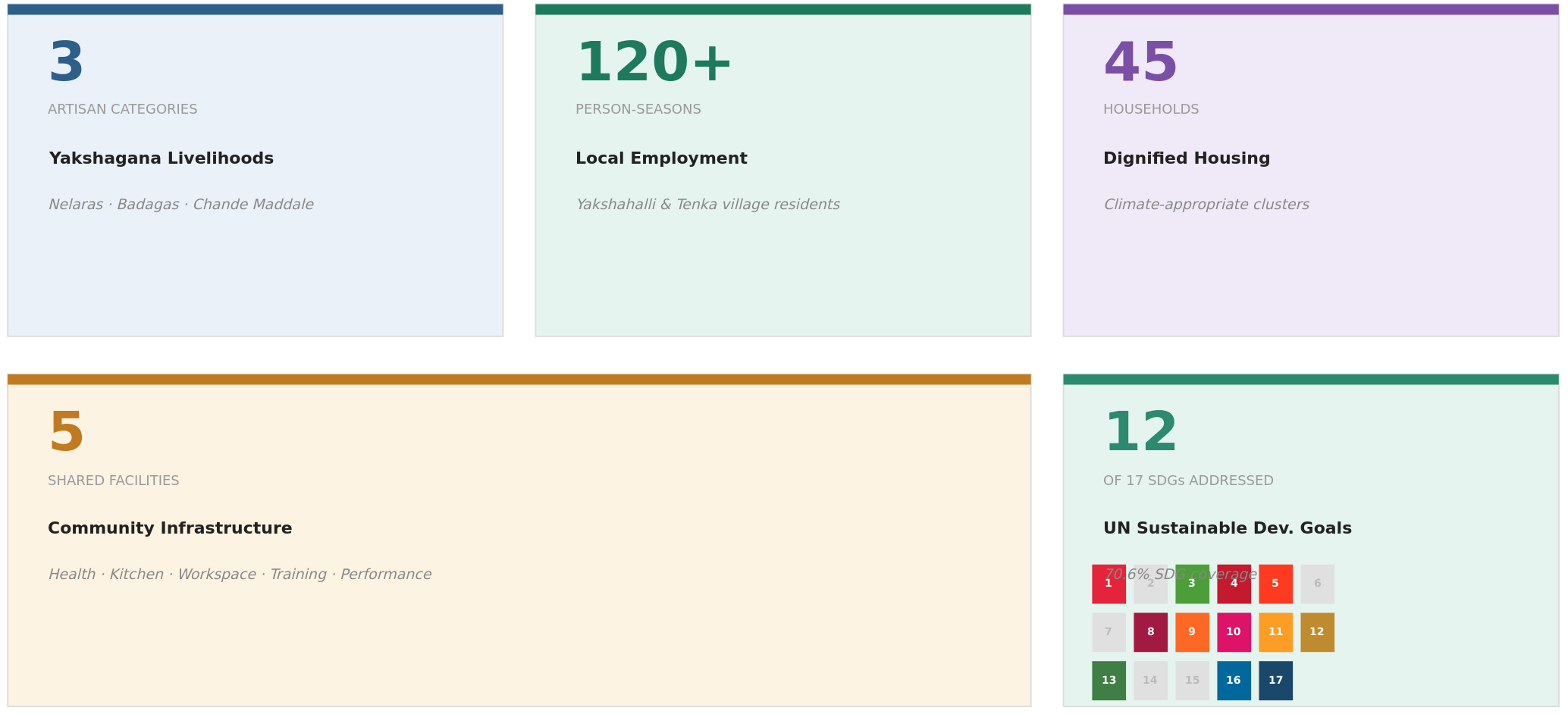 The social performance of Yakshahalli is evaluated across livelihood, equity, health, and cultural dimensions. The programme directly supports the livelihoods of three categories of Yakshagana-associated artisans — the nelaras (stage builders), badagas (costume makers), and chande maddale (drum makers) — by providing dedicated workspace, storage, training facilities, and cooperative sales infrastructure within a single settlement. Housing provision addresses the specific challenges of a scattered artisan community, offering dignified, climate-appropriate residential clusters with equitable access to shared facilities including a primary health unit, community kitchen, and cultural performance space. The programme is designed to be gender-inclusive across all workspace and training typologies, and the phased implementation model ensures that local labour is prioritised throughout the construction process, generating employment for residents of both Yakshahalli and the broader Tenka village.
