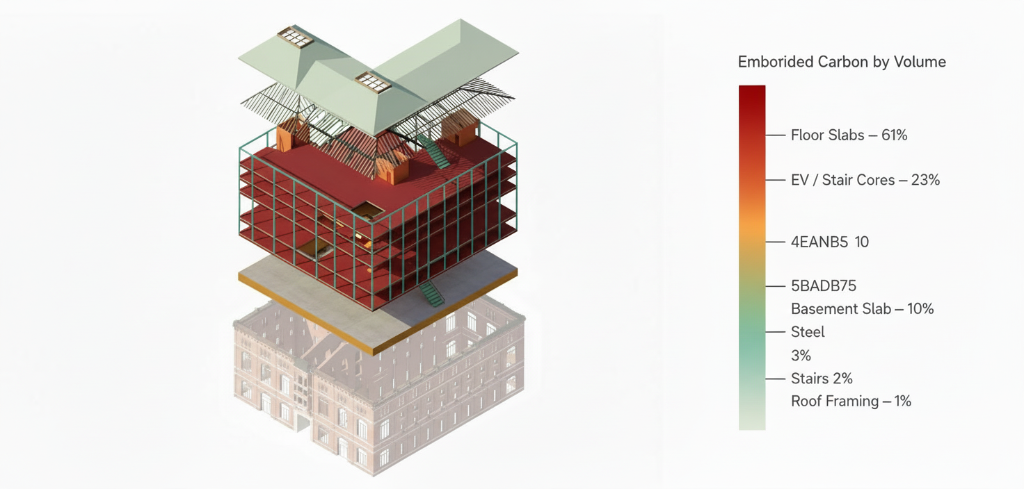 The first step in any post-design carbon assessment is understanding which building elements drive material demand. For the Alley-Eblana retrofit, new interventions include a basement slab, steel columns and beams, floor slabs, stair and elevator cores, and a hybrid roof structure. When broken down by volume, floor slabs and cores together account for 84% of all new material — making them the primary lever for embodied carbon reduction. Steel, roof framing, and stairs together comprise the remaining 16%, each individually modest but collectively significant when multiplied across a multi-storey structure.