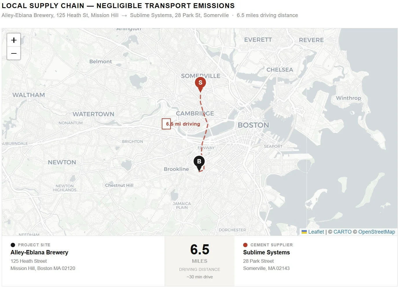 To push further, the analysis identifies Sublime Systems as a locally available net-zero cement manufacturer located just 6.5 miles from the site. Unlike ordinary Portland cement — which emits CO₂ through both fuel combustion and the chemical decomposition of limestone — Sublime Systems uses an electrochemical process that replaces limestone with non-carbonate rocks, avoiding both emission sources entirely. The process also enables the upcycling of construction waste and industrial by-products into new cementitious material, closing a second material loop alongside the GGBS substitution. At 6.5 miles from the site, transportation-related emissions are negligible.